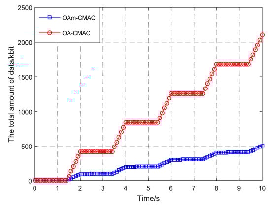 The performance evaluation of the proposed MAC protocol of the OA-UWSN was conducted on the OMNeT++ platform. The OA-CMAC protocol was compared to the OA-MAC [] protocol based on the OA-UWSN proposed by our research group. The performance was evaluated on metrics including throughput, energy consumption, and other indicators evaluating protocol performance.