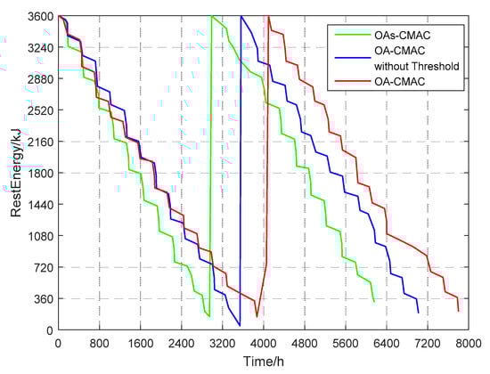 Since the OA-CMAC protocol proposed in this paper increases the limitation of the energy threshold, the lifetime of the UWSN node is further extended compared to the OA-CMAC that does not set that energy threshold. Figure 9 shows node energy consumption simulations in the OA-CMAC and OAs-CMAC protocols. The simulation curve is the node’s two lifetimes. In each curve, the gentler part of the decrease is the energy consumption during the acoustic handshake and optical handshake. The steep part is the energy consumption of optical communications, and the steepest is the loss of acoustic communication energy. As can be seen from the figure, the lifetime of the OA-UWSN node was 7800 h, the lifetime of the OA-UWSN node without the energy threshold was 6400 h, and the lifetime of a single acoustic communication node was 6000 h. Therefore, the lifetime of the OA-UWSN node increased by 14% compared to the OA-UWSN node without an energy threshold, which was 30% longer than the lifetime of the OAs-CMAC.