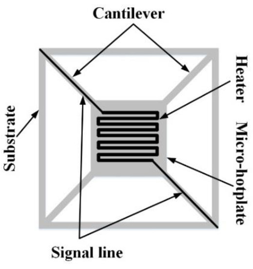 Micro-Pirani vacuum sensors are based on the fact that the heat loss of an MHP to its ambient environment through gas conduction is proportional to the vacuum pressure in a vacuum system [23]. Figure 1 shows the classical design of a vacuum sensor based on an MHP for improving vacuum sensor performance [24]. The MHP is supported by four cantilevers and these cantilevers are connected to a substrate. The heater, which is usually a thermistor, is located in the MHP, and signal lines are embedded in the cantilevers.