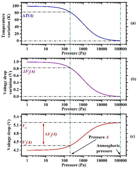 where ∆Vf is the voltage drop variation, Ve is the voltage drop across the diode with the equilibrium temperature, Va is the voltage drop across the diode with the environment temperature, and |dVf/dT| is the temperature coefficient of the diode. When the vacuum pressure changes from atmospheric pressure to pressure A, as shown in Figure 2, the temperature variation of the MHP is ΔT(A) in Figure 2a, the voltage drop variation generated by the temperature variation is ΔVf(A) in Figure 2b, and the measured voltage drop varies from Va to Ve(A) in Figure 2c. The voltage drop falls with decreasing vacuum pressure because of the negative temperature coefficient of the diode and the rising temperature variation in the MHP. Voltage drop variation indicates the response of the micro-Pirani vacuum sensor to a certain vacuum pressure in the dynamic vacuum pressure range. It is usually expected to be as large as possible, and the sensitivity is therefore improved. There are two ways to simultaneously reduce power consumption and enlarge voltage drop variation: Larger temperature variation and a greater temperature coefficient.