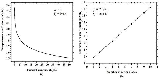 where α is a coefficient. Equation (6) indicates that the temperature coefficient is proportional to the number of series diodes. More series diodes can enlarge the temperature coefficient thus that greater voltage drop variation can be achieved, which is similar to prolonging the length of temperature-sensitive material. In addition, the temperature coefficient of the diode is a function of the forward bias current and can be increased by reducing the forward bias current. Figure 3 shows the simulated results of temperature coefficient dependence on the forward bias current and the number of series diodes. It can be seen from Figure 3a that the temperature coefficient rises as the forward bias current decreases. From the point of view of enlarging the temperature coefficient, this can be accomplished by reducing the forward bias current, which is also helpful for reducing power consumption. Figure 3b shows another way of enlarging the temperature coefficient by increasing the number of series diodes.
