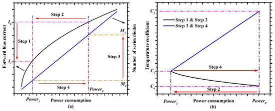 These two methods—lowering the forward bias current and increasing the number of series diodes—of enlarging the temperature coefficient can be combined for a greater temperature coefficient without increasing power consumption. Figure 4a shows the detailed process of how to achieve a greater temperature coefficient with the same power consumption. Step 1: The forward bias current is cut down from I0 to I1. As a result, which is shown as Step 2, the power consumption is reduced from Power0 to Power1 because of the reduced forward bias current. However, a strengthened temperature coefficient is achieved. Step 3: The number of series diodes is increased from M0 to M1, which contributes to the further improvement of the temperature coefficient. Step 4: More series diodes increase the power consumption back to where it was, which varies from Power1 to Power0. Figure 4b shows the results of how the temperature coefficient varied during the detailed process. The reduced forward bias current led to the increase of the temperature coefficient from C0 to C1, and then the temperature coefficient changed from C1 to C2 because of the increasing number of series diodes. Overall, a greater temperature coefficient was obtained with the same power consumption. Considering the operating voltage, we decided to use six series diodes with a low forward bias current for this work.