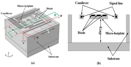 In addition to the temperature coefficient of six series diodes, temperature variation is another factor that influences the voltage drop variation according to Equation (3). Under the condition of the same power consumption and vacuum pressure, temperature variation depends on the structure of the micro-Pirani vacuum sensor. Compared with traditional MHP-based micro-Pirani vacuum sensors, sensor structure optimizations were made for larger temperature variation. One aspect was to minimize the number of cantilevers from the traditional four to two, which mainly reduced the solid heat loss. Another aspect was to redesign the sensor geometries to further improve the temperature dependence on vacuum pressure. Figure 5a shows the schematic view of the redesigned micro-Pirani vacuum sensor structure, and Figure 5b shows the cross-sectional view along the A–B direction shown in Figure 5a. Two cantilevers connected the substrate and MHP, and the MHP was suspended over the substrate. Series diodes were embedded in the MHP, and its signal was connected out by signal lines made on cantilevers.
