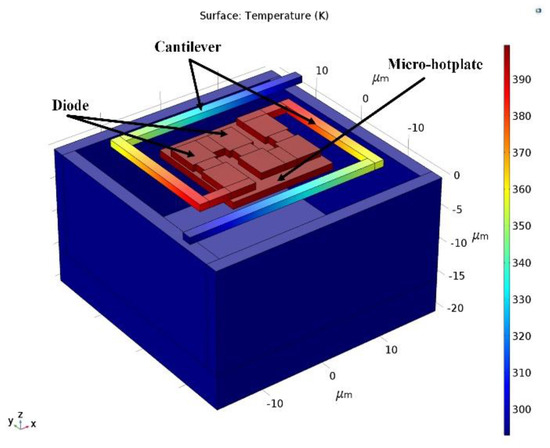 Figure 6 shows the simulated result of temperature distribution in the structure of the micro-Pirani vacuum sensor in a certain vacuum pressure. It can be seen that the MHP had the highest temperature, and the temperature went down along the cantilevers to the temperature of the substrate, which was the environment temperature. The temperature variation of MHP led to voltage drop variation across the series diodes.