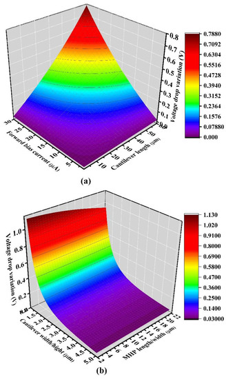 It can be seen from Equation (8) that temperature variation is proportional to forward bias current. Here, the temperature variation was inversely proportional to the cross-sectional area of the cantilever and the area of the MHP, which were MN and WL, respectively. Figure 7a,b shows the simulated temperature variation of the six series diodes dependence on the forward bias current, cantilever length, MHP width/length, and cantilever width/thickness. These relationships shown in Figure 7 and Equation (8) can be explained by the mechanism of heat generation and heat loss. Greater electric heating power is obtained and thus more heat is generated when a greater forward bias current is applied. Having a longer cantilever, less cross-sectional area of the cantilever, and a smaller MHP area reduces heat loss, and all of these factors lead to more heat accumulated in the MHP, which behaves according to the larger temperature variation. To obtain a larger temperature variation, the area of the MHP and the cross-sectional area of the cantilever should be reduced as much as possible.
