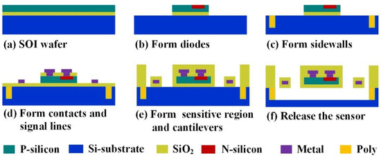 After design, simulation, and optimization, the micro-Pirani vacuum sensor with six series diodes was fabricated with a CMOS-compatible process, which is shown in Figure 8. The detailed process is as follows: (a) The structure was fabricated with a silicon-on-insulator (SOI) wafer, and the top Si layer of the wafer was p-type <100>, with the square resistance of 8~12 Ω. (b) The top Si layer was the first ion implanted with boron fluoride (BF3) on a doping concentration of 1013 at the power of 100 keV, then the second ion was implanted with phosphorus on a doping concentration of 3 × 1014 at the power of 100 keV and etched to form the diodes. (c) The Si substrate was patterned by deep reactive ion etching (DRIE) and filled with silicon oxide (SiO2) and poly Si to protect the sidewalls of the cavity from being etched. (d) Al was sputtered and patterned thus that the diodes were in series and their signals could be outputted. (e) The sensitive region and cantilevers were formed by deposition and etching of plasma-enhanced chemical vapor deposition (PECVD) SiO2. (f) The structure was released by front-side xenon difluoride (XeF2) dry etching.
