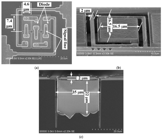 Figure 9a shows the scanning electron microscope (SEM) image of the series diodes before they were covered by SiO2, and it can be seen that the size of a single diode was 7.4 × 4.6 μm. Figure 9b,c shows the top- and cross-sectional-view SEM images of the fabricated micro-Pirani vacuum sensor, respectively. The size of the sensor excluding the area of the pad was 35 × 35 μm, and the size of the sensitive region was 16.5 × 16.5 μm. In addition, the released gap between the MHP and the substrate was about 22 μm. The XeF2 etched the Si substrate underneath the sensitive region through the clearance on both sides of the cantilever, and this led to the rough surface of the substrate underneath the MHP. However, this can be improved or even eliminated by optimizing the fabrication process.