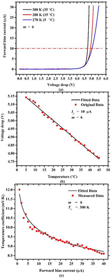 where Is is the saturation current of the diode, n is the ideal factor of about 1, m is the number of series diodes, and k is Boltzmann constant. q and A are the elementary charge and area of the diode, np0 and pn0 are minority carriers in n-type and p-type regions, Dn and Dp are diffusion coefficients of electron and hole, and Ln and Lp are diffusion lengths of electron and hole, respectively. Further, γ is a constant and Eg is the energy gap of Si. Combining Equations (4) and (5), the temperature coefficient can be derived as