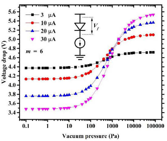 Temperature-sensitive materials are usually used in traditional micro-Pirani vacuum sensors, but the diode-based micro-Pirani vacuum sensor replaces it with a diode by taking advantage of the temperature coefficient of the diode. The relationship between the forward bias current If and the applied forward bias voltage Vf of series diodes is given in the following approximate equations [27,28]: