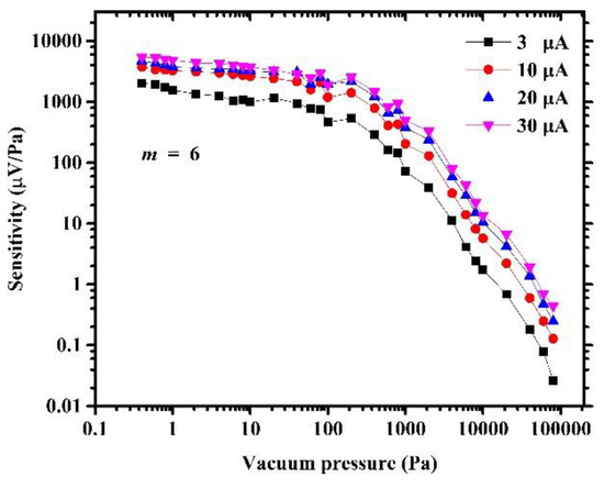 Figure 12 shows the sensitivity of the micro-Pirani vacuum sensor varied with vacuum pressure and forward bias current. The sensitivity was inversely proportional to the vacuum pressure. This can be explained by the fact that there is a decreasing influence of vacuum pressure on gaseous heat loss as the vacuum pressure increases, except that, sensitivity was proportional to the forward bias current. The greater the forward bias current, the higher the sensitivity. However, the forward bias current should be limited to avoid sensor failure because of the very high temperature of the MHP under the condition of low vacuum pressure.