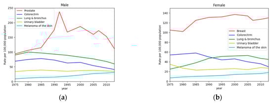 Trend of incidence rates for several cancers in the United States from 1975 to 2013. (a) and (b) present the trend on males and females, respectively.