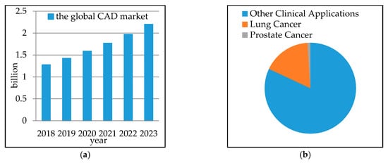 Demonstration of the CAD market trend and its market share of lung cancer. (a) prediction of global CAD market, (b) proportion of different CAD systems applications.
