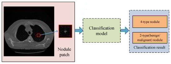 Many works have been addressed to solve this problem. The input is a lung nodule image patch, and the output is the type. As formally shown in Equation (1), let x be a lung nodule image patch with size of l*w*c (l, w, and c denote the length, width, and channel). y is the nodule type. f() is the classification method.