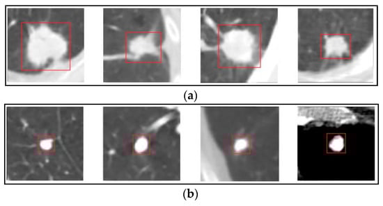High malignancy suspicious cases are given in (a) and low malignancy suspicious cases are given in (b) [13]. Red bounding boxes denote the locations of the nodule.