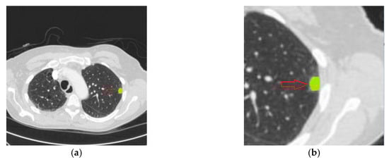 Lung CT image [13]: (a) Original image with nodule (green color), (b) the part of CT image with nodule > 3 mm ROI (green color). Note that the xml file includes the outline of the node (only its boundary points). In this case, the entire nodule is displayed for better understanding and visibility.