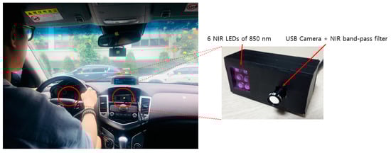 As shown in Figure 2, two image-capturing devices containing an illuminator composed of an NIR camera and six NIR light-emitting diodes (LEDs) of 850 nm are installed, one each at the front of the vehicle dashboard and the center of the vehicle, to monitor the driver. As the 850 nm NIR illuminator used in this study has nearly no glare, it does not interfere with the driver’s vision or influence driving. It enables images to be obtained at a brightness at which the driver’s eyes can be detected regardless of external lighting during the day and night. By using the NIR cameras equipped with this illuminator, it is possible to monitor the driver from wide angles without being affected by external lighting. As shown in Figure 2, an 850 nm band-pass filter is attached to the NIR camera to minimize the external influences such as sunlight. We could thus obtain images with uniform brightness relying only on the 850 nm NIR used in this study. These two image-capturing devices were used to obtain driver images of 1600 × 1200 in pixel size (three channels), and through the two images, a three-channel composite image was generated (Step (1) of Figure 1). The composite image obtained thus was used as input in the shallow CNN to select an image closer to the frontal face (Step (2) of Figure 1, and the details are explained in Section 4.2). This is because, in the side face image, a part of the eye disappears or is covered owing to the head being turned, making eye detection difficult. However, the use of a frontal face image provides a higher eye detection rate. To detect eyes more efficiently from the frontal face image, the region of interest (ROI) of the eye region is set (Step (3) of Figure 1). The ROI set thus is used as input in the faster R-CNN, enabling more accurate eye detection (Step (4) of Figure 1, and the details are explained in Section 4.3). Among the eye candidates obtained through faster R-CNN, the distance and angle conditions among the candidate regions are applied and the candidate regions outside this range are deemed erroneous detections and are excluded. Subsequently, the final two eye detection candidate regions are selected (Step (5) of Figure 1, and the details are explained in Section 4.4). A geometric transformation matrix is used for the two cameras and the final eye regions obtained through faster R-CNN from the frontal face image. The eye position of the remaining side face image is detected (Step (6) of Figure 1 and the details are explained in Section 4.5).