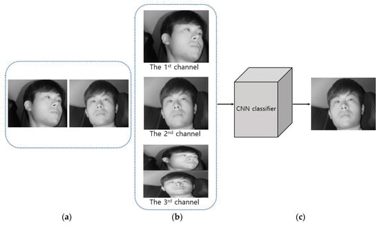 Classification of frontal face image. (a) Image captured through the 1st camera and the 2nd camera; (b) Combined three-channel image for the input to shallow CNN; (c) Selected frontal face image.