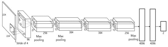 As shown in Figure 4, AlexNet used as the shallow CNN has a relatively shallow structure of five convolutional layers, three pooling layers, and three fully connected layers. Unlike other CNN models formed from complex structures, by using the AlexNet model, this study can classify the frontal face image even faster [].