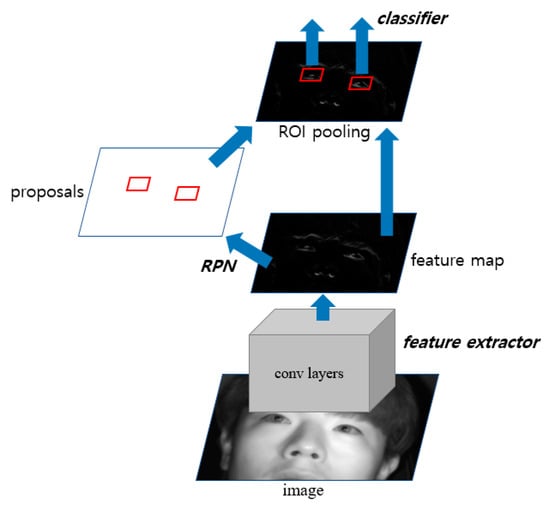 In this study, faster R-CNN performs classification of two classes (object and background) in RPN and classification of three classes (open eye, closed eye, background) in classifier. Thus, in each RPN and classifier structure, weight is trained to minimize the loss function for each anchor box or proposal box in the mini-batch: