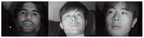 In Equation (5), the transformation matrix is obtained by multiplying S and F−1, and the geometric relationship between the frontal face image and side face image can be parameterized. The T matrix was obtained beforehand through training data. To solve the problem of T matrix differing by Z distance from the camera to the driver’s face, the T matrix is obtained beforehand for approximately three distances based on the distance between the driver’s eyes. The T matrix that matches the distance between the eyes of the input image is used. This obtained transformation matrix T and the driver’s eye box coordinates () from the frontal face image obtained in the abovementioned faster R-CNN are used to calculate the eye box coordinates () of the side face image, using Equation (6):