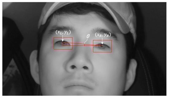 In the process of detecting the driver’s eyes through faster R-CNN described above, we inserted several detection conditions to raise the rate of detection. The number of driver’s eyes is fixed at two, so that, if there are three or more final eye detection candidate boxes, then the boxes other than the boxes for the two actual detected eye regions are judged as erroneously detected. Consequently, the post-processing conditions are applied and, after excluding the erroneously detected boxes, the final two eye detection boxes are selected. Normally when driving, the driver looks forward and to the side, and hence, the head roll angle does not extend beyond a certain range. Therefore, if there are three or more eye detection boxes, we first calculate the angle θ, the head roll angle between the boxes; only boxes that form angles within a certain range are selected. To calculate θ, we obtained center coordinates x and y of each detected box to calculate the distance between the detected boxes. and in Figure 7 indicate the center coordinates of the left eye detection box and right eye detection box, respectively, whereas θ indicates the angle between the eye boxes owing to head roll. The angle between the boxes, θ, is calculated through Equation (4). After calculating the angle between the boxes, θ, the two candidates that form the smallest of these values are first selected as eye boxes: