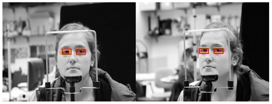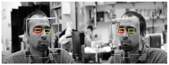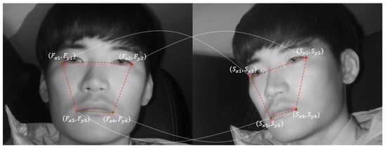 The abovementioned faster R-CNN is applied to the images obtained from the two cameras, thus achieving high reliability. However, this method has the limitation of high computational cost. Therefore, this study uses geometric transformation [] between the two cameras, as shown in Equations (5) and (6). The driver’s eyes of the frontal face image detected above are used to map the driver’s eye regions of the remaining images. Figure 8 shows the mapping of the driver’s eye regions between the frontal face image and side face image.