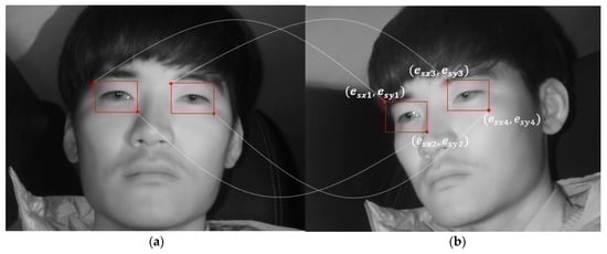 In Equation (6), (, ) and (, ) indicate the left upper and right lower coordinates of the eye box from the frontal face image detected through faster R-CNN, respectively. (, ) and () indicate the left upper coordinates and right lower coordinates of the eye box to be mapped to each side face image, respectively. Accordingly, Equation (6) above is applied to both the left and right eyes detected through faster R-CNN (Figure 9a), and the left and right eye regions are both mapped in the side face image (Figure 9b). By applying geometric transformation thus, the driver’s eyes are finally detected in the images obtained from the two cameras.