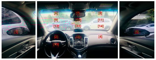 Most previous driver databases of vehicle environments are not open databases. Among existing databases, the Chinese Academy of Sciences Pose, Expression, Accessories, and Lighting (CAS-PEAL) face database [] consists of data obtained in various poses, expressions, accessories, and lighting environments, and is thus widely used in facial recognition technology. However, as it is obtained in a laboratory rather than actual vehicle environments using a driver as the target, the database does not reflect the various elements of a vehicle environment. In addition, while there is another dataset with driver images in the RobeSafe driver monitoring video (RS-DMV) vehicle environment [], as this dataset only contains data obtained from a single camera, it cannot be used in studies based on two cameras, such as this study. Consequently, to evaluate the performance of the system proposed in this study, we collected data for our own database (DDCD-DB1) through the experimental setup shown in Figure 2. DDCD-DB1, the learned faster R-CNN, and algorithms are released as shown in [] in order to enable other researchers to perform a fair performance valuation. When acquiring DDCD-DB1, the driver’s gaze area was divided into 15 zones as shown in Figure 10. The drivers gazed at the 15 zones divided out beforehand in order, and a total of 26 participants were each assigned eight different situations (i.e., wearing a hat, wearing four different types of glasses (rimless, gold-rimmed, half-frame, and horn-rimmed), wearing sunglasses, making a call through mobile phone, covering face through hand, etc.), and the data were collected (Figure 11). By considering many different situations that could occur in actual driving, we could measure performance for various situations and obtain high reliability. As the participants gazed at the designated regions in turn, natural head rotations that would occur in actual driving were permitted, and other restrictions or instructions were not provided. When acquiring actual driving data, to avoid any risk of a traffic accident, rather than actually driving, a real vehicle (a Renault-Samsung model SM5 []) was started from a parked state in various locations (from daylight road to a parking garage). By conducting the experiments thus, data could be collected in an environment most similar to an actual driving situation. For all training and testing of the CNN model used in this study, an Intel® Core™ i7-7700 CPU@3.60 GHz (Intel Corp., Santa Clara, CA, USA), 16 GB memory and NVIDIA GeForce GTX 1070 (1920 CUDA cores and 8 GB memory) graphics card [] desktop computer was used. The CNN model training and testing algorithm used in this study was implemented through Windows Caffe (Version 1) [].