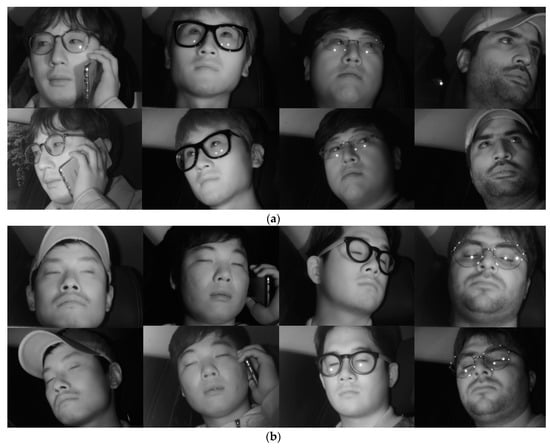 Examples of images in DDCD-DB1. (a) Driver’s open eye images captured through the 1st camera (the 1st row images) and 2nd camera (the 2nd row images); (b) Driver’s close eye images captured through the 1st camera (the 1st row images) and 2nd camera (the 2nd row images).