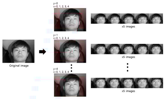 We trained the shallow CNN classifier to select the frontal face image among the images obtained from the two cameras for which the eyes almost never disappeared or were covered owing to head rotations. Table 5 shows the database used in this CNN model training and testing. To avoid the overfitting problem that may have occurred during the training process in this study, data augmentation was performed only for training data. For an image, a total of four pixels are each shifted one pixel up, down, left, and right, and 25 cropped augmented images were obtained (Figure 12). As shown in Table 5, the augmented images were only applied to training data; for testing data, original data rather than augmented images were used.
