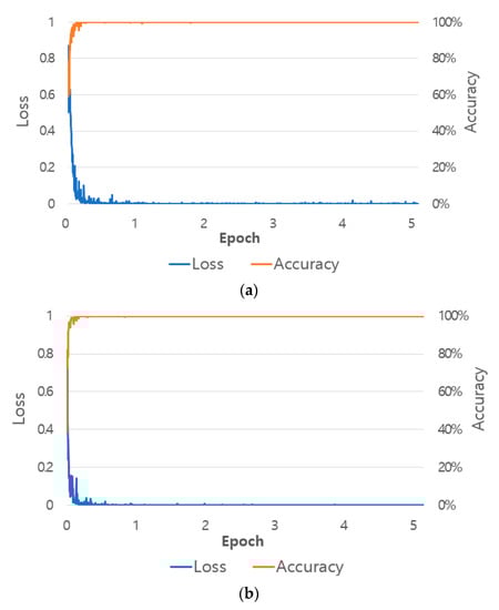 Figure 13 shows a graph of loss and accuracy during training. The x-axis shows the number of performed epochs, the left side of the y-axis shows the loss value, and the right side of the y-axis shows training accuracy. As the number of epochs increases, loss converges closer to 0, and accuracy converges to 100%. This indicates that the shallow CNN training performed in this study successfully had no overfitting.