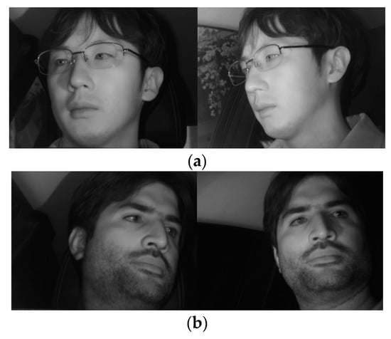 In the next experiment, we used the Columbia Gaze Data Set (CAVE-DB) open database [] to evaluate the performance of the method proposed in this study. As described in Section 5.1, as this is not an open database of driver’s faces obtained through two cameras in vehicle environments, while not an actual vehicle environment, this study used the CAVE-DB, which acquired facial data of various gaze directions from multiple cameras indoors. This dataset consists of 5880 images of 56 people of various head poses and gaze directions. Among the images of five different head poses per person, we selected one pair of images most similar to the head pose obtained from the two cameras inside the vehicle used in this study. The examples of image pairs with head poses are shown in Figure 22.