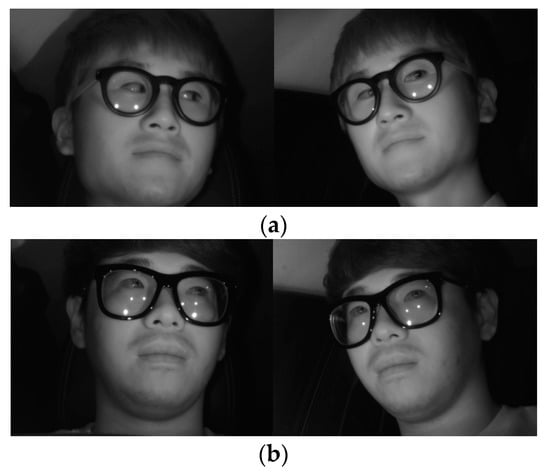 To overcome these disadvantages of the single-camera-based method, the multiple-camera-based methods have been studied. Existing studies [,] have proposed systems that check for driver inattention through two cameras installed in the vehicle. In particular, in [], a faceLab eye-tracking system was used in the images of the driver obtained through the cameras installed on the dashboard and steering wheel to detect the user’s eyes. Through eye movement, a support vector machine (SVM) model was used to determine whether the driver was distracted. Ahlstrom et al. also used a commercial eye-tracking device for eye detection and proposed a system to detect driver inattention []. The driver’s face was monitored through two cameras installed behind the A-pillar and center console in the vehicle; SmartEye Pro 4.0, an eye-tracking device, was used to detect the eyes and measure the direction of the driver’s gaze. The images of the driver monitored through two cameras can effectively obtain data even in a wide range of head rotation. However, an expensive eye-tracking device was used to detect the eyes, and the performance of the proposed system depends on the performance of the eye-tracking device. In addition, the eye-tracking data of 23% of the total mileage in the experiment had low reliability. Moreover, to effectively detect the driver’s eyes, the experiment was conducted with restrictions on glasses, mascara, beards, moustaches, and other factors. Tawari et al. detected facial feature landmarks using a local-feature-based method in the driver images obtained through more than two cameras inside the vehicle []. Accordingly, they proposed a system to measure the state of the driver through eye and head pose detection []. Bergasa et al. proposed a system that analyzes the degree of driver inattention []; eyes are detected from the face model points inside the face region obtained from the AdaBoost face detector [], and the percentage eye closure parameter is measured and combined with other visual cues. Ji et al. proposed a system that determines the state of the driver using various visual cues through eye detection []. The driver was monitored through two cameras installed on the dashboard inside the vehicle; one camera monitored the face through a wide angle focused on the face, whereas the other camera monitored the eyes through a narrow angle focused on the eyes. First, a two-ring NIR illuminator was used to obtain images of bright and dark pupils, and after detecting the pupil regions through the vehicle images of the two images, regions deemed eye candidates were distinguished using the SVM model to determine the actual eye regions. Based on the obtained eye information, the eyelid and gaze movement information was calculated and combined with other visual information obtained from the face images of the wide-angle camera, thereby determining the driver state and measuring inattention. The use of the NIR illuminator minimizes the influence of nearby lighting, securing image quality in various actual environments including day and night. Here, eye detection is simpler and faster than the process of eye detection following face detection. However, the experiment was not conducted in a real vehicle environment; the narrow-angle camera that focuses on the driver’s eyes requires a precise process to match the focus. In addition, as driver images from various angles cannot be obtained from the camera, it is vulnerable to excessive rotations of the driver’s head. When accurate bright or dark pupil images cannot be obtained (e.g., when the head is turned or is far from the camera), there is difficulty in eye detection. In addition, there have also been studies on eye detection algorithms that classify the region into “eyes” or “not eyes” using a neural classifier after eye location is detected through the Hough transform method []. This multiple-camera-based method allows free movement of the driver’s head and achieves high reliability through the combination of information from two images. The main drawback is the high computational cost of processing two images.