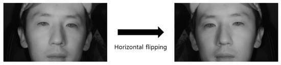 For the second experiment, the performance of the eye detection method proposed in this study was evaluated. Table 7 shows the database used in the training and testing of the faster R-CNN in this study. To classify open eye and closed eye while simultaneously detecting eyes, training was conducted using the labeled dataset for each class. A two-fold cross validation was performed for the performance evaluation. In addition, for faster R-CNN training robust in a larger variety of environmental changes, blurred images were added to the training data of Table 7, and the images were used as training data. Additionally, to avoid the overfitting problem, data augmentation was performed through horizontal flipping (Figure 16). Thus, twice the number of augmented images for training was obtained. As shown in Table 7, the augmented images were used only in the training data; for testing data, the original testing data of Table 7 were used.