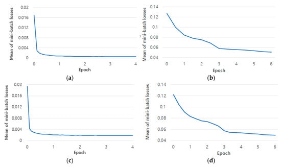 In this study, the stochastic gradient descent (SGD) method [] was used in training the shallow CNN model. This is a method to determine the optimized weight that can minimize the difference between the result obtained from the CNN during training and the ground-truth result. Instead of all the data, a division of the training set via mini-batch size iterations method was used to conduct training at a faster speed with several iterations. In this study, the following parameters were used in performing the SGD method: base learning late = 0.0001, gamma = 0.1, batch size = 30, momentum = 0.9, weight decay = 0.0005, and epoch = 5. For the ground-truth frontal face image which has relatively fewer loss of eye area between two camera images, the image closer to the frontal face was manually selected. If both images had visible eyes and small head rotation and were close to the frontal face, then the image obtained from the first camera was classified as the frontal face image.