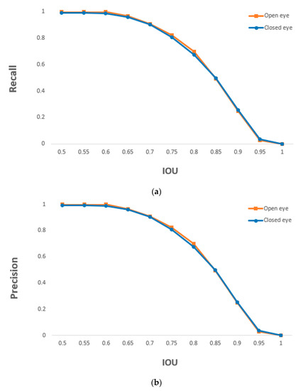 Graphs of (a) recall and (b) precision of the detection of open and closed eye according to IOU thresholds.