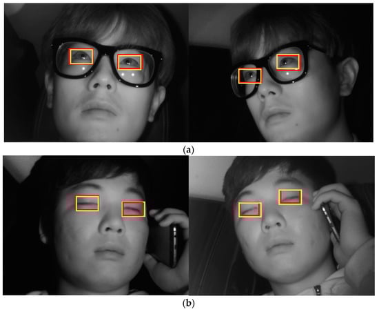 Figure 19 shows the final correctly detected driver eye detection images obtained through the proposed method, whereas Figure 20 shows the error cases. For the error cases, while the driver’s eyes in frontal face image were accurately detected by faster R-CNN (left images of Figure 20a,b), in the process of mapping the driver eye regions in the side face image through geometric transformation, the regions could not be accurately mapped owing to excessive head rotation (right images of Figure 20a,b).