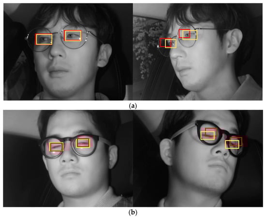 Examples of correctly detected driver’s eye obtained using the proposed method: (a) open eye; (b) closed eye. (Yellow and red rectangles show the ground-truth and detected boxes, respectively).