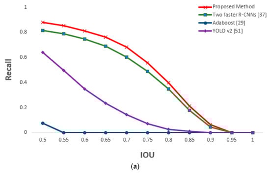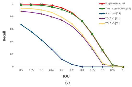 In this section, we compare the accuracy and processing time of other methods with those of our proposed method for driver’s eyes detection. Other methods include the two faster R-CNNs method in which the frontal face image from shallow CNN is not classified and faster R-CNN is applied for each of two camera images, the AdaBoost eye detection algorithm [], and the you only look once (YOLO) (versions 2 and 3) detector [,]. At an IOU value of 0.5, Table 9 shows that the recall and precision of the proposed method were better than those of the other methods.