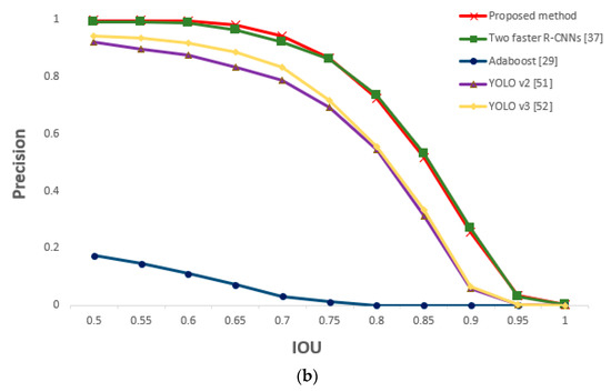 For the driver images obtained from the two cameras, faster R-CNN was applied to both in order to detect the eyes. Similar performance as that of the two faster R-CNNs method was obtained; this is because our proposed method is based on faster R-CNN. However, the method of this study is slightly more accurate because it detected the eyes by applying the faster R-CNN only to the frontal face image selected through shallow CNN (easier eye detection). As geometric transformation was applied to the remaining image (i.e., side face image) to map the eyes, the processing time to detect the eyes of both images could be reduced to approximately half of that required in the two faster R-CNNs method. Figure 21 is a graph of the measured recall and precision values according to changes in the IOU threshold, confirming the superior performance of the proposed method.