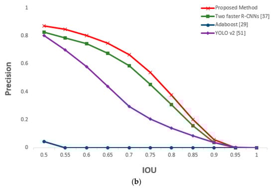 Comparative graphs of (a) recall and (b) precision of the proposed and previous methods according to IOU thresholds.