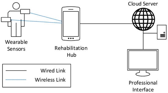 In the single-user use case, Figure 4, the RH is responsible for collecting and processing data from only one patient. For this reason, the RH is not characterized by specific requirements, and could be implemented as a general-purpose device, such as a smartphone or a tablet, for instance by developing an application to collect information from the sensors, elaborate raw data by the application of a specific biomechanical model, and upload them to the CS. The connection between the RH and the sensor can be realized via a short-range wireless link, e.g., Wi-Fi, IEEE 802.15.4, or Bluetooth Low Energy, owing to the short distance between the nodes. The patient interface could be easily implemented, showing on the device screen, the real-time execution of the self-evaluation task or the exercise and some specific parameters useful for the patient to check their performances. Eventually, the dedicated professional interface must allow physicians and physiotherapists to browse information from multiple patients simultaneously.