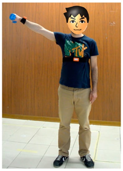 As a possible example, one may consider the application of inertial devices to monitor the upper limb movements for shoulder MSD rehabilitation. A possible sensor deployment for this specific case is reported in Figure 1. As we showed in our preliminary work reported in [], inertial sensors can be placed on the sternum, the forearm, and the scapula.