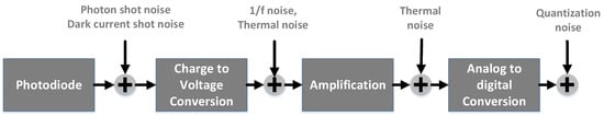 Moreover, charge to voltage conversion and subsequent amplification of the electrical signal are also noisy owing to electronic fluctuations. These processes notably introduce flicker or noise and thermal noise, which are modelled using the additive white Gaussian noise (AWGN) [42]. In addition, residual error due to quantization is also modelled using the independent additive white Gaussian noise [15].