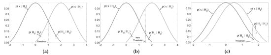 Here, the decision in Equation (6) can be taken by comparing the observations x against a threshold . This is elaborated graphically in Figure 4a, where the threshold is plotted as a dotted line. Note that the values greater than the threshold are more likely to be distributed according to while the values less then the threshold are more likely to be distributed in accordance with . Therefore, the above hypothesis testing problem can be given as