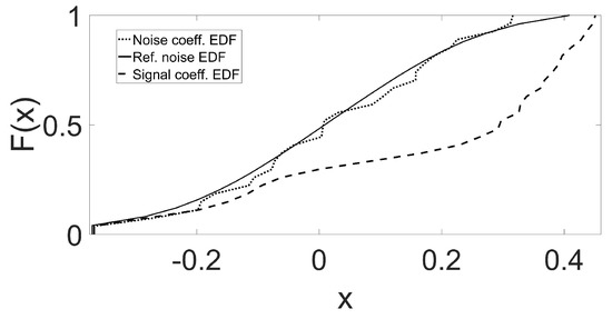 Hypothesis testing based signal and noise detection: is reference Gaussian CDF plotted along with of of signal coefficients (dashed line) and the EDF of noise coefficients (dotted line).