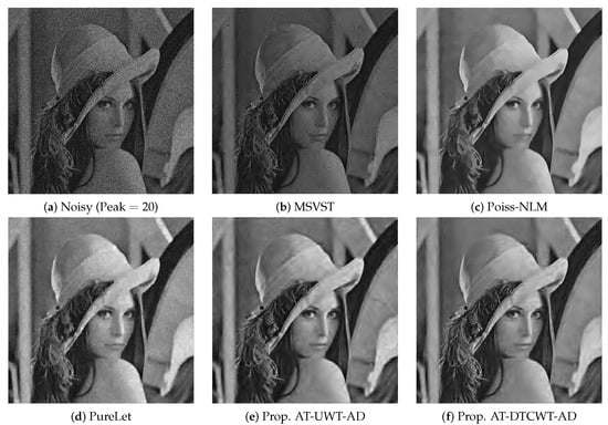 We also display denoised images of ‘Lena’ and ‘Padma River’, respectively, in Figure 8 and Figure 9. In Figure 8, noisy ‘Lena’ image at signal peak is displayed in Figure 8a along with the denoised ‘Lena’ images by MSVST, Poiss. NLM, PureLet, AT-AD-UWT and AT-AD-DTCWT, respectively, in Figure 8b–f. Observe from Figure 8d that PureLet yielded blurry artifacts which were spread all around the denoised ‘Lena’ image. Figure 8c shows the denoised signal by the Poiss-NLM which seems to be devoid of the artifacts but at the cost of the loss of image details, due to over-smoothing of the denoised signal. The denoised signals by the proposed methods AT-AD-UWT and AT-AD-DTCWT, shown in Figure 8e,f respectively, showed lesser artifacts as compared to the PureLet and the MSVST while also extracting more signal details. When compared to Poiss-NLM, denoised images by the proposed AT-AD-DTCWT method extracted more details but at the expense of slight artifacts. The AT-AD-UWT also extracted higher signal details compared to the Poiss-NLM but with some visible artifacts. PureLet and MSVST also changed the brightness of the denoised images whereas the proposed methods did not alter signal brightness even at such higher noise level.