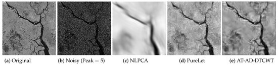 Figure 9 compares the denoising performance of the proposed AT-AD-DTCWT method against the PureLet and the NLPCA at very high noise level, i.e., signal peak , on ’Padma River’ image. Original and noisy versions of ‘Padma River’ image are shown in Figure 9a,b while the denoised images from NLPCA, PureLet and the proposed AT-AD-DTCWT are shown in Figure 9c–e respectively. NLPCA not only over-smoothed the recovered image details but also blurred it, see Figure 9c. PureLet and the proposed AT-AD-DTCWT managed to recover significant image details even at such a high level of signal-dependent additive noise, see Figure 9d,e. Note that Purelet showed significant blurring artifacts in Figure 9d while denoised image by the proposed AT-AD-DTCWT recovered image details effectively with very little artifacts even at such a high input noise level, see Figure 9e.
