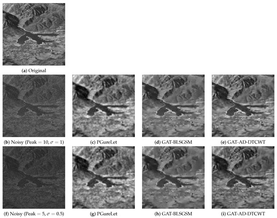 Figure 10 shows original, noisy and denoised ‘Ogden Valley’ images obtained from the comparative methods. Noisy images displayed in Figure 10b,f were, respectively, corrupted by Poisson–Gaussian noise at signal peak and 10 and AWGN standard deviation . These noisy images were denoised using PGureLet, GAT-BLSGSM and proposed GAT-AD-DTCWT method which are, respectively, displayed in second, third and fourth columns of Figure 10. Observe that the PGureLet blurred the recovered images and distorted the information, see Figure 10c,g. GAT-BLSGSM recovered the image details well (see Figure 10d,h) as compared to the denoised images from PGureLet. However, denoised images by the GAT-BLSGSM yielded spike-like artifacts which are more evident in denoising at higher input noise level, as shown in Figure 10h. Denoised images by the proposed GAT-AD-DTCWT method are displayed in Figure 10e,i where not only image details have been preserved well but also the contrast and bright information is intact.