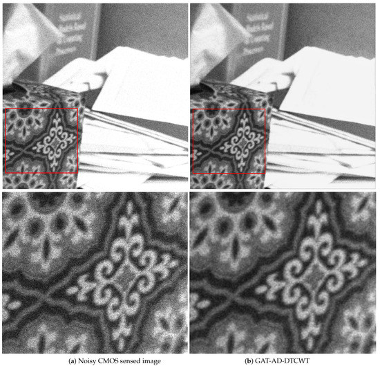 Figure 11 displays the noisy CMOS image along with the denoised image using the GAT-AD-DTCWT method. Noisy image (top row) and the zoomed in view of the highlighted part (lower row) are, respectively, shown in Figure 11a, while the denoised image using the GAT-AD-DTCWT (top row) and the zoomed in view of the highlighted region (lower row) in Figure 11b. As can be observed from the Figure 11 (top row) that the proposed method successfully suppresses majority of the real CMOS sensor noise. The zoomed-in view of the highly detailed region in the noisy and the denoised image are shown in Figure 11 (lower row), where granular noise pattern or shot noise spikes are visible in the noisy image patch. However, in the denoised image patch, these granular patterns have been successfully suppressed by the proposed method.